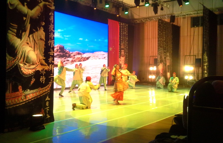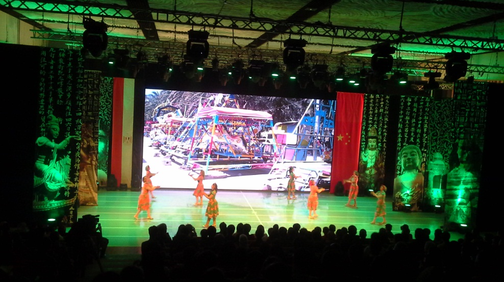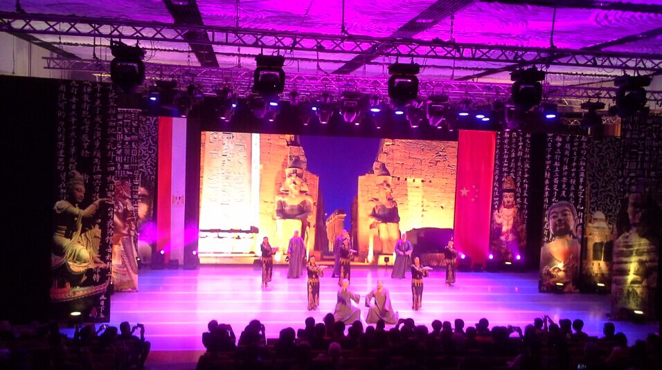 当埃及《转群舞》演员随着中国歌曲将中埃两国国旗展示在观众眼前,观众激情高昂,报以热烈的掌声,同时将本次演出推向高潮。