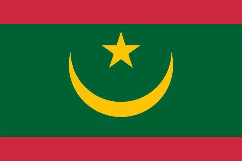 毛里塔尼亚国旗启用于1959年4月1日,国旗长宽比例为3:2。是一面绿色的旗帜,与中间新月抱星的图案都是伊斯兰教的象征。金色的图案代表了撒哈拉沙漠,而两种颜色是泛非颜色。