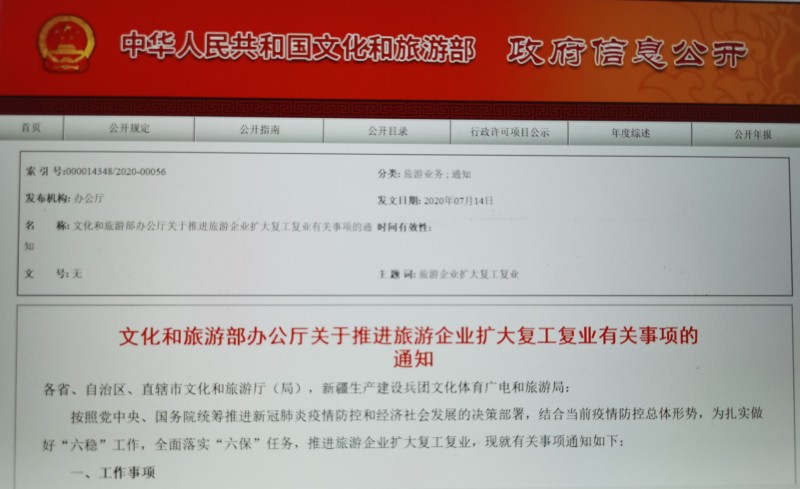 7月14日,《文化和旅游部办公厅关于推进旅游企业扩大复工复业有关事项的通知》和《旅行社有序恢复经营疫情防控措施指南》出台,指出各地在做好疫情防控工作的前提下,可恢复旅行社及在线旅游企业经营跨省团队旅游及“机票+酒店”业务。