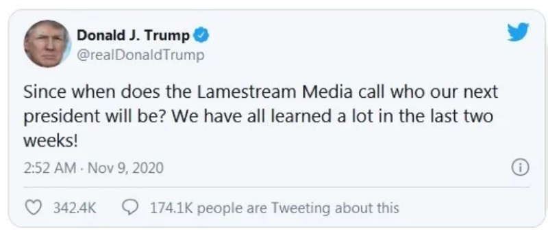 风险地图 >> 特朗普发推:什么时候由媒体来宣布下任总统了?