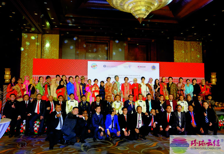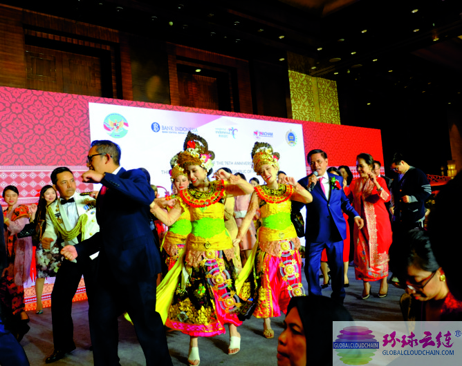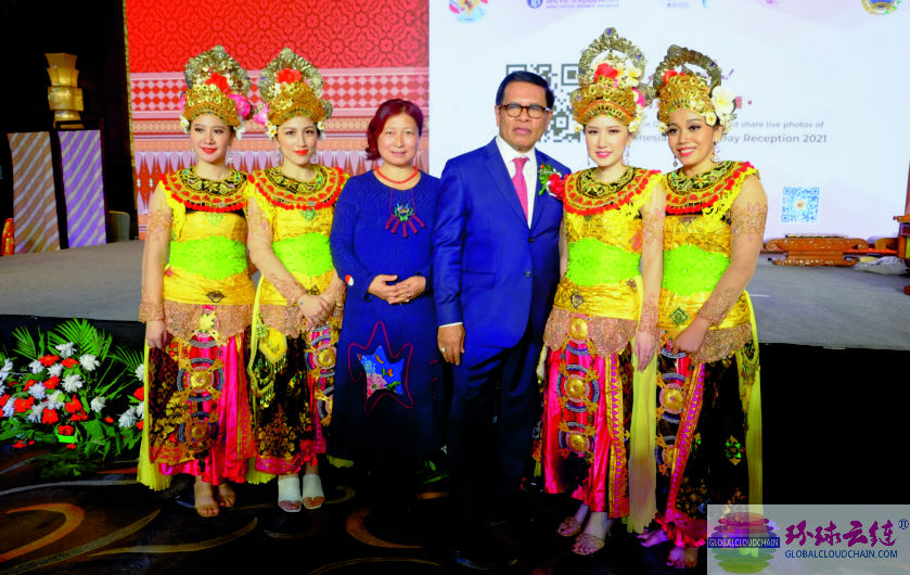 环球云链国际旅行社董事总经理王晓玲与印尼驻华大使周浩黎阁下及身着民族服饰的印尼少女愉快合影