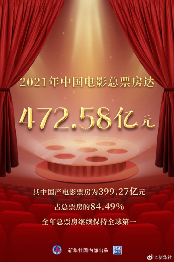 文化链友 >> 2021年中国电影总票房472.58亿元,继续保持全球第一