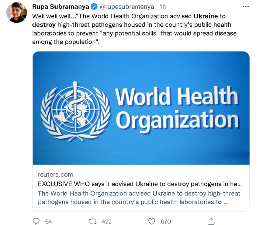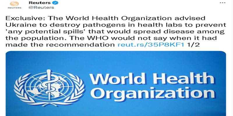 据英国路透社报道,世界卫生组织于周四表示,该组织已经建议乌克兰那些存有“高危病原体”的“公共卫生实验室”摧毁这些病原体,以防止战火令这些实验室出现病菌外泄事故,危及大众健康。此事很快在境外的网络上引起了大量关注。