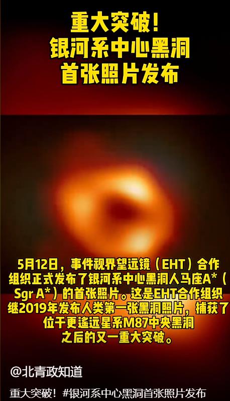 5月12日,事件视界望远镜(EHT)合作组织正式发布了银河系中心黑洞人马座A*( Sgr A*)的首张照片。这是EHT合作组织继2019年发布人类第一张黑洞照片,捕获了位于更遥远星系M87中央黑洞后的又一重大突破。