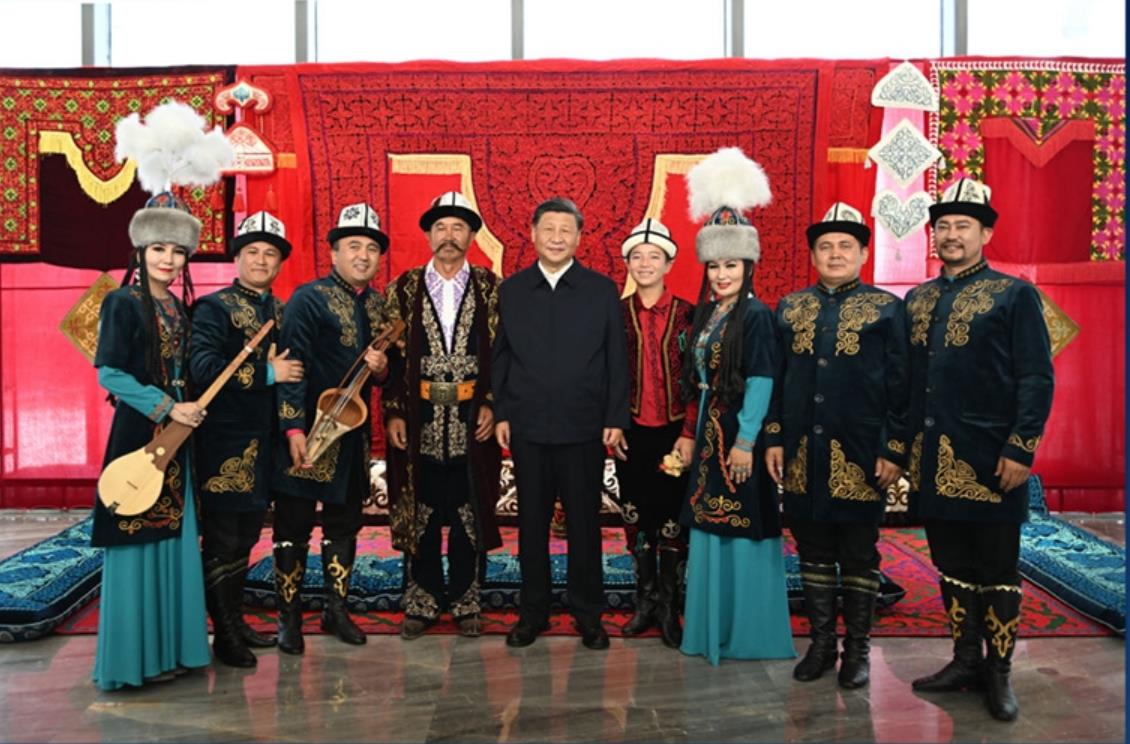 观看了柯尔克孜族英雄史诗《玛纳斯》说唱展示,习近平总书记同《玛纳斯》非物质文化遗产传承人亲切交谈,称赞他们的表演非常有感染力,并与大家合影留念。