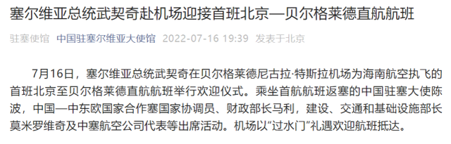 7月16日,塞尔维亚总统武契奇在贝尔格莱德尼古拉·特斯拉机场为海南航空执飞的首班北京至贝尔格莱德直航航班举行欢迎仪式。乘坐首航航班返塞的中国驻塞大使陈波,中国—中东欧国家合作塞国家协调员、财政部长马利,建设、交通和基础设施部长莫米罗维奇及中塞航空公司代表等出席活动。机场以“过水门”礼遇欢迎航班抵达。