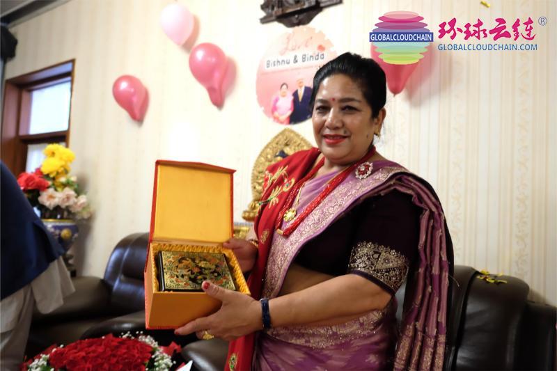 世界生态组织亚洲管理中心办公室主任,环球云链·世界商人网总编王晓玲(Marissa)为尼泊尔驻华大使夫人送上平遥推广漆器,祝福大使和夫人的金婚盛典