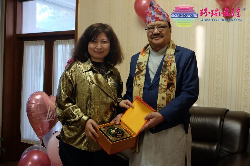 世界生态组织亚洲管理中心办公室主任,环球云链·世界商人网总编王晓玲(Marissa)为尼泊尔驻华大使送上平遥推广漆器,祝福大使和夫人的金婚盛典