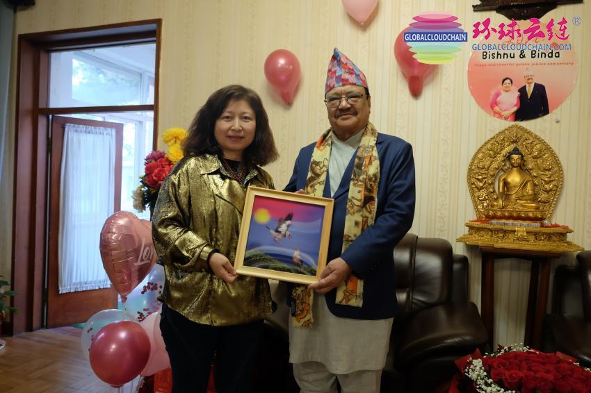 世界生态组织亚洲管理中心办公室主任,环球云链·世界商人网总编王晓玲(Marissa)为尼泊尔驻华大使送上世界鸟王艾雅康先生的摄影作品,祝福大使和夫人的金婚盛典