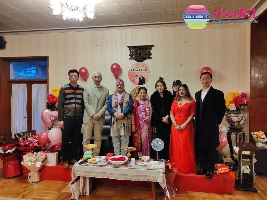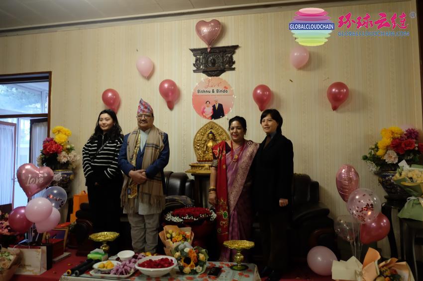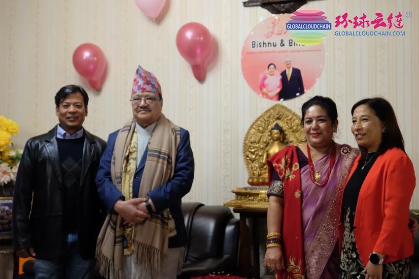 尼泊尔驻华大使和夫人的金婚纪念庆典现场,与年轻夫妇合影留念,期望未来更美好