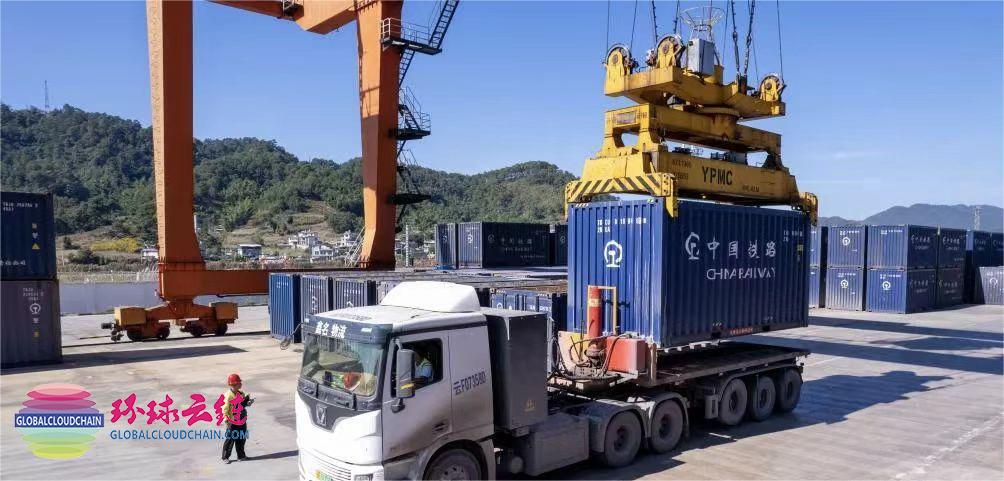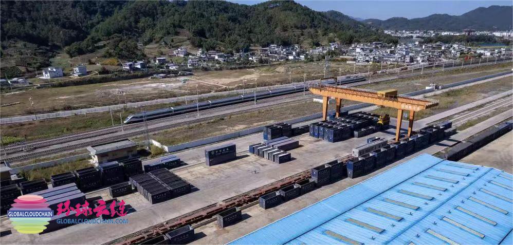 ▲ 中老铁路宁洱站货场的工人在指挥龙门吊装卸铁路集装箱