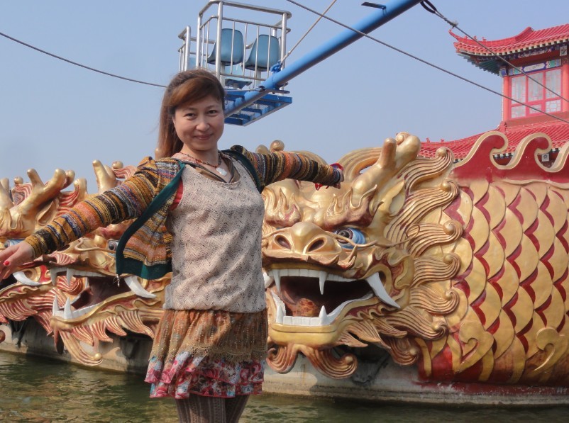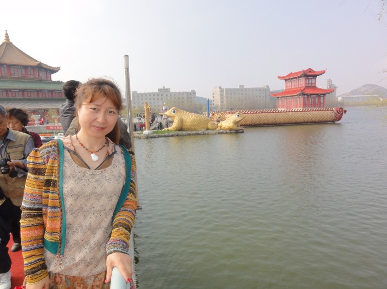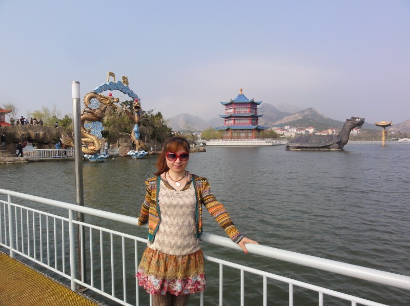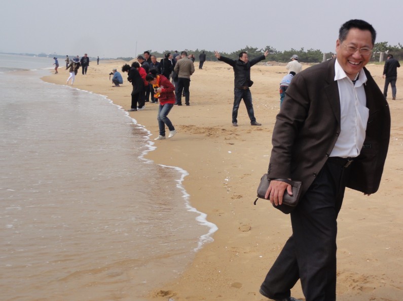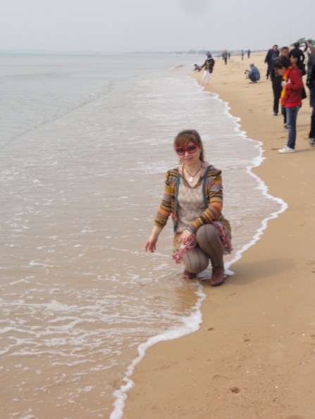 亚太城市网主编王晓玲在威海洲际旅游度假区院子的海滩试水