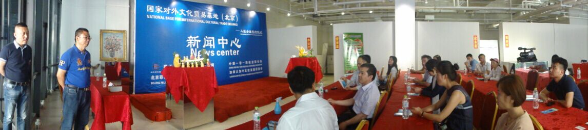 5月28日,2016第四届京交会首日下午,国家对外文化贸易基地(北京)迎来了山西省商务厅副巡视员田国玉率领山西省文化产业代表企业一行10余人考察团并举行现场商务交流会,启动了第四届京交会国家对外文化贸易基地分会场。文化部艺术发展中心文化产业发展研究中心主任张雷雷,歌华文化发展集团总工陈刚,中国(俄罗斯)一带一路投资联合会主席荆宝贵,歌华、国家对外文化贸易基地代表、北京菲利克斯猫动漫发展有限公司总经理、中国传统文化产业发展中心文化金融委员会副主任许洪双,国际文化产业投资洽谈会海外合作中心主任王晓玲,北京歌华信德文化贸易中心副总经理张秀菊,北京歌华美术公司赵弈然等40余人出席。中国湛江仲裁委员会国际(北京)文化金融仲裁院、中国湛江国际仲裁院北京文化金融分院院长,中国传统文化产业发展中心文化金融委员会副主任马骏鹏先生主持了此次会议。