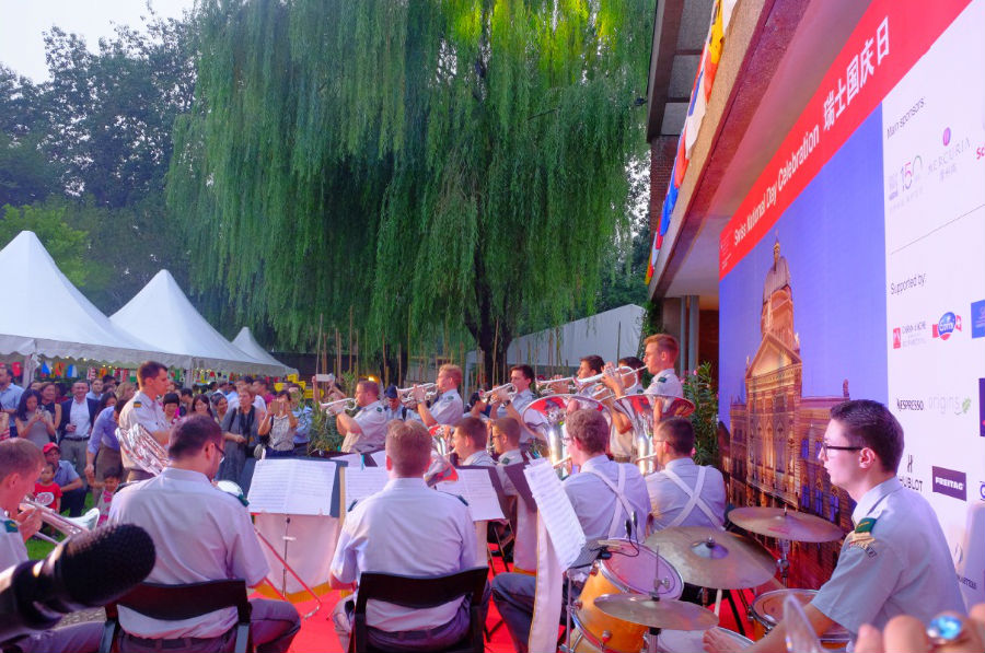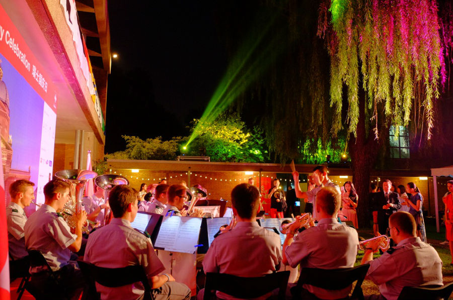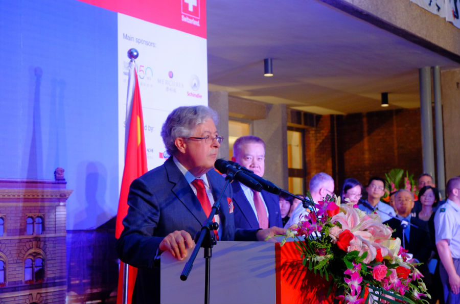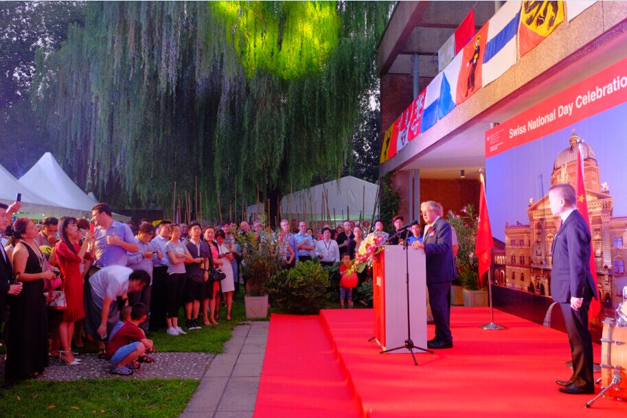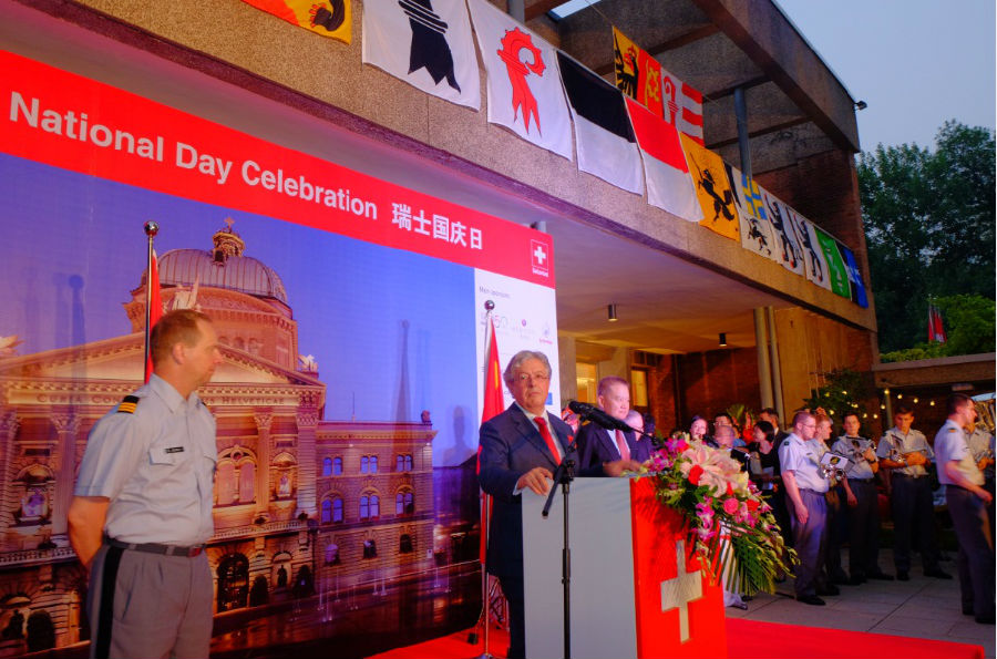 瑞士驻华大使戴尚贤在致辞中说:“在过去几年中每年都有100-130万中国游客到瑞士旅游,这也增进了两国关系。今天我们不仅关注瑞士,更关注中瑞友谊以及全方位促进中瑞友谊。今年瑞中关系再上新高,自从去年2015年庆祝国庆日后,瑞士联邦主席今年4月对中国进行了访问,并与习主席签订了战略合作伙伴关系。让我们两国能更加紧密的在一起,能经济更强大一点,不断加深彼此友谊,以敢为人先的精神,互利互助的意识以及相互学习的渴望,概括起来就是创新和自主的精神。正是本着这种精神,我们也注意到今天瑞士的国庆也是中国的建军节,也正是秉承着创新精神,我们今天首次也是特意邀请到瑞士军乐团来和我们一起庆祝中瑞良好关系,14名年轻的军乐手全部来自瑞士。他们将在亚洲进行巡演。而今天正值国庆日,他们特意前来演出,以显示我们非常重视中瑞友好关系。这些年轻的军乐手很多得过瑞士和国际大奖,希望大家一同欢聚一堂,其乐融融。”