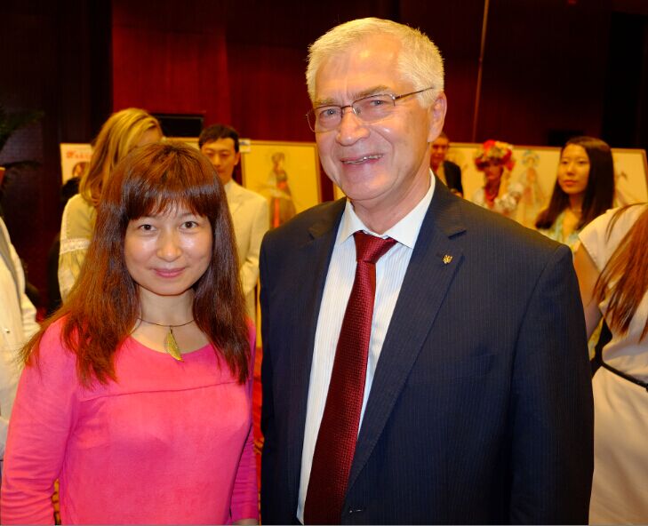 世界商人网主编王晓玲与乌克兰驻华大使焦明先生在乌克兰独立25周年招待会上合影