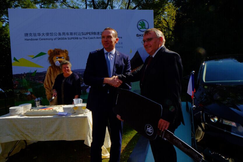 大众汽车(中国)投资公司执行总裁、斯柯达总裁韩麦安先生及闪亮的捷克驻华大使馆公务用车斯柯达SUPERB速派车