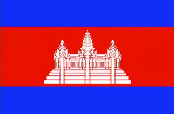 柬埔寨国旗:图案呈长方形,长与宽之比为5:3。由三个平行的横长方形相连构成,中间是红色宽面,上下均为蓝色长条.红色象征吉祥和喜庆,蓝色象征光明和自由。红色宽面中间绘有白色镶金边的吴哥庙,这是著名的佛教建筑,象征柬埔寨悠久的历史和古老的文化。