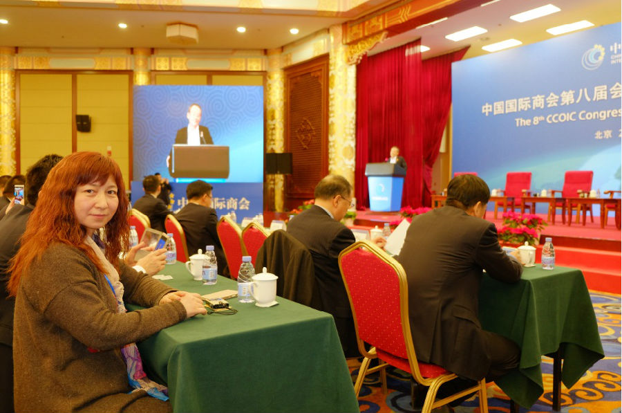 世界商人网董事总经理兼总编王晓玲在中国国际商会2016年年会王石演讲现场