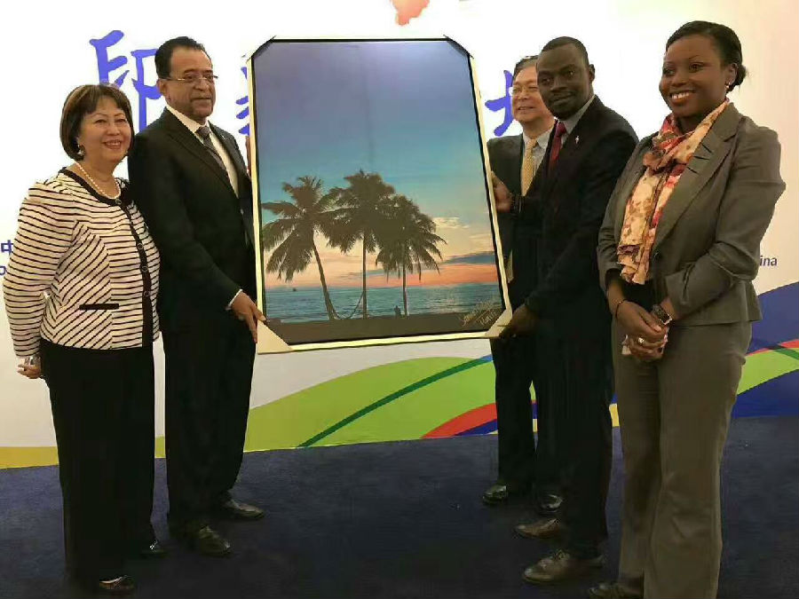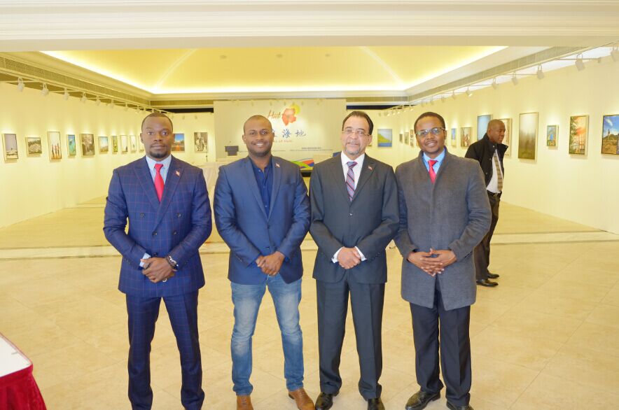 海地贸易发展局在华常驻代表拉尔夫先生(左3),摄影作品的作者帕缪尔勒·达美矛斯(左1)与海地的另两位工作人员合影