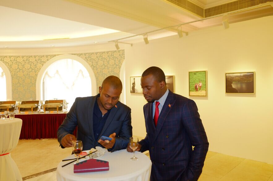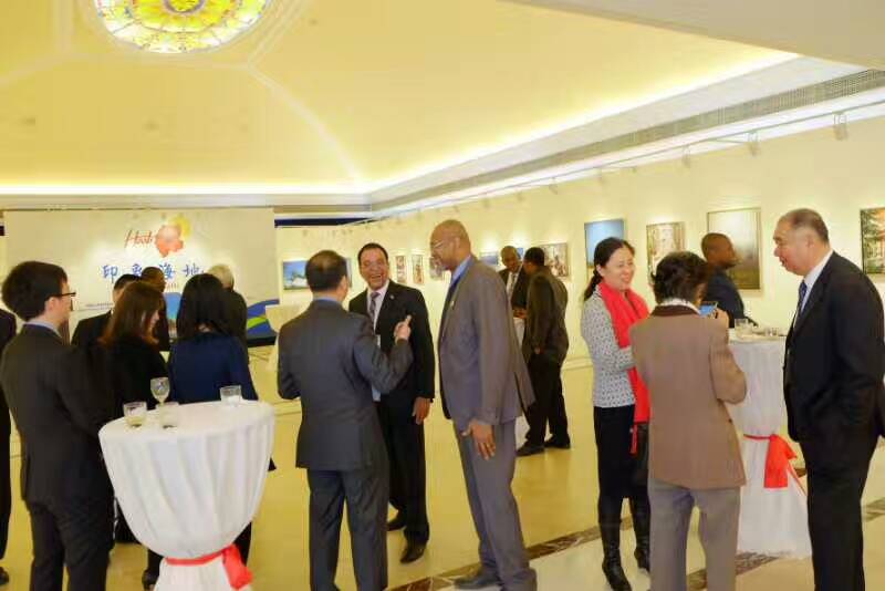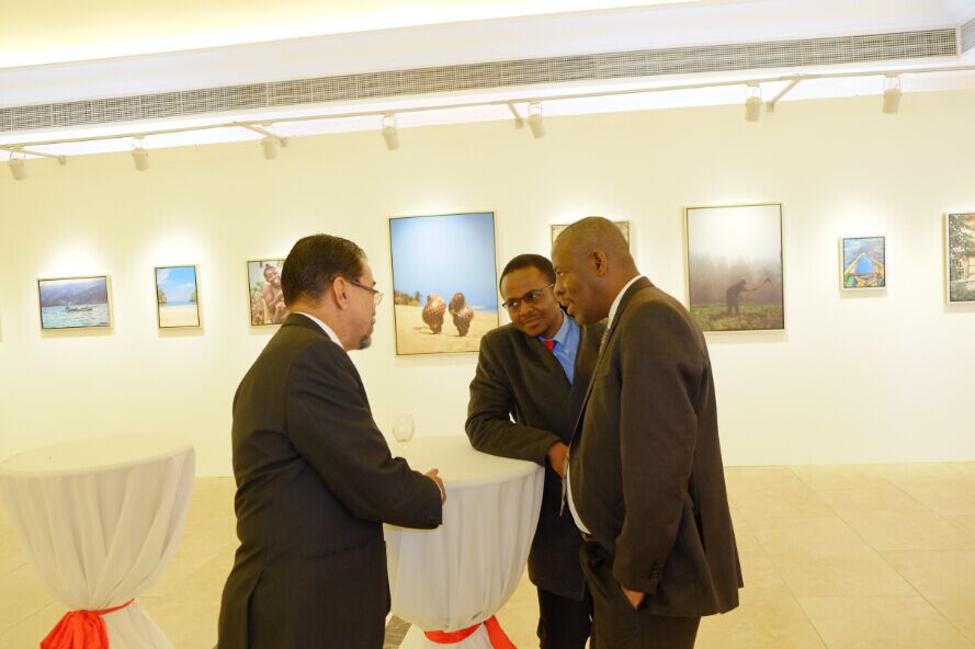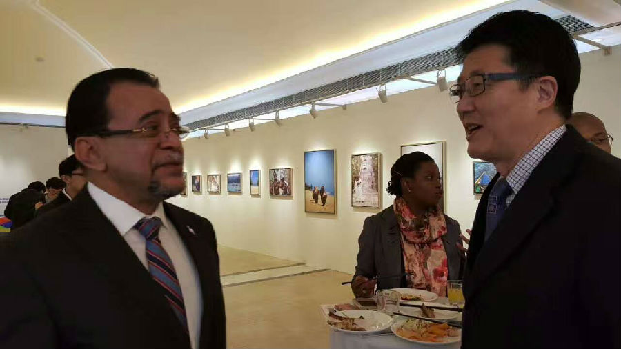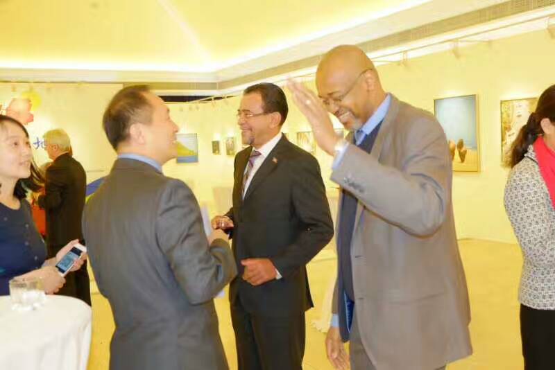 海地贸易发展局在华常驻代表拉尔夫先生与牙买加驻华大使在印象海地主题摄影展上交换心得