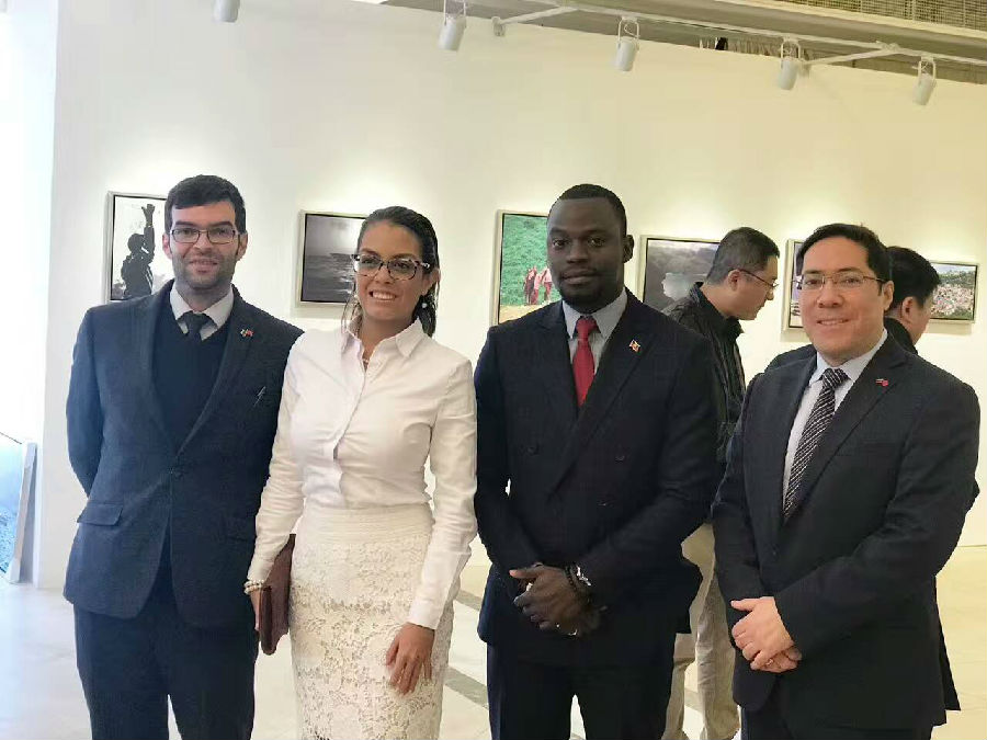 牙买加驻华大使(左1)、格林纳达驻华大使(左2)、海地贸易发展局在华常驻代表拉尔夫先生(左4),苏里南驻华大使(左5)在参观印象海地主题摄影展时与摄影作者(左3)合影留念