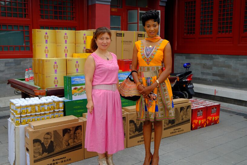 世界商人网董事总经理兼总编王晓玲与塞拉利昂中国文化的传播使者玛利亚女士在纪念建军90周年捐赠活动上合影