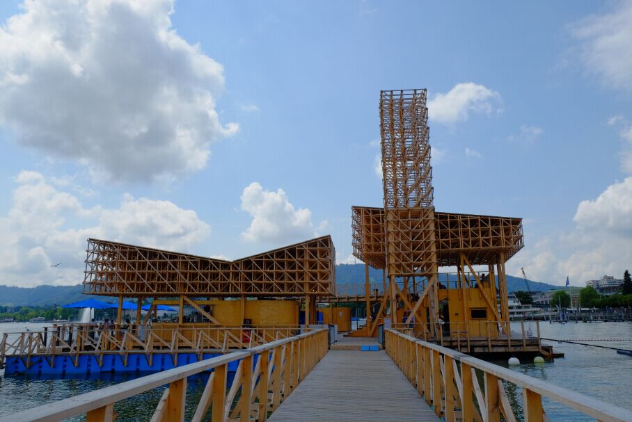 这是由从苏黎世理工学院汤姆·埃默森建筑工作室里挑选出的30名建筑系学生组成的设计团队,为第十一届欧洲当代艺术双年展设计和建造了一座亭子。它以城市中心为背景,以倒影亭的形式漂浮在湖面上,作为能够两年举办