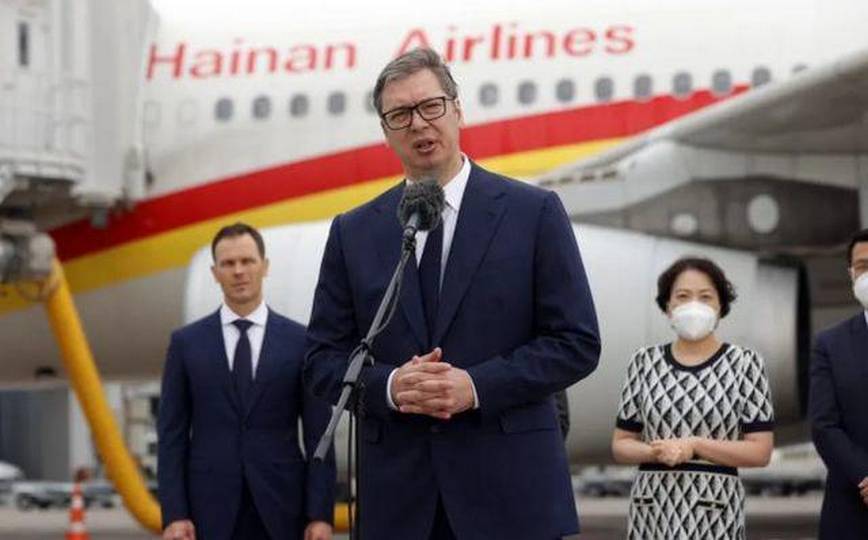 塞尔维亚总统武契奇赴机场迎接首班北京—贝尔格莱德直航航班7月16日,塞尔维亚总统武契奇在贝尔格莱德尼古拉·特斯拉机场为海南航空执飞的首班北京至贝尔格莱德直航航班举行欢迎仪式。乘坐首航航班返塞的中国驻塞