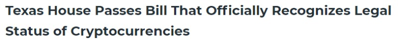 FX168财经报社(北美)讯 据U.Today 5月11日最新报道,德克萨斯州众议院刚刚通过了“虚拟货币法案”,该法案承认加密货币的法律地位。