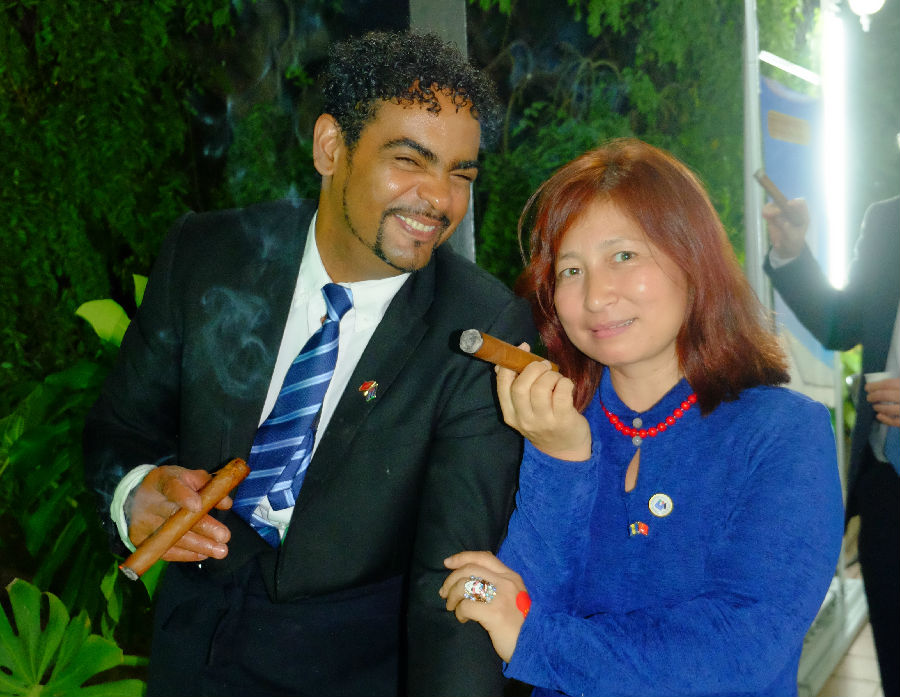 环球云链国际旅行社董事总经理王晓玲在古巴驻华大使馆与古巴驻华使馆工作人员品古巴哈瓦那雪茄