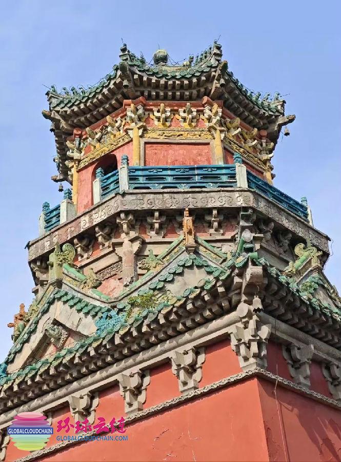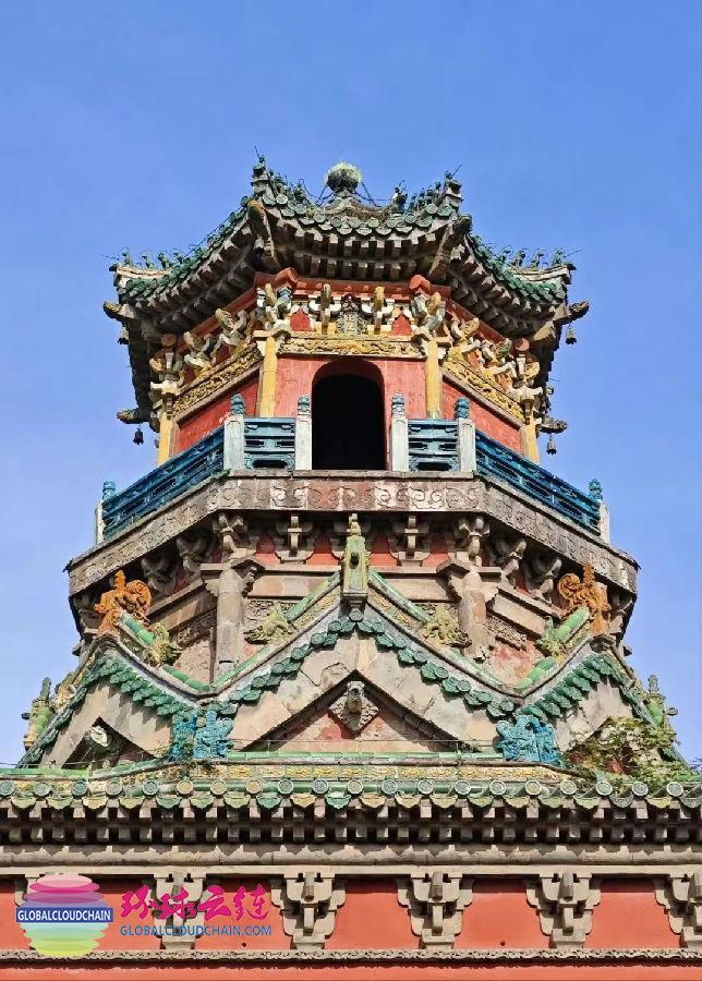 玉皇阁:是延庆观的主体建筑,始建于元太宗五年,通高18.25米,分为上、中、下三层,全部由青砖、青石和琉璃瓦件砌成,整个建筑不施梁木,结构严谨,富于变化,是汉蒙文化巧妙结合、具有元代特征的明代无梁阁 。