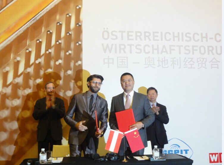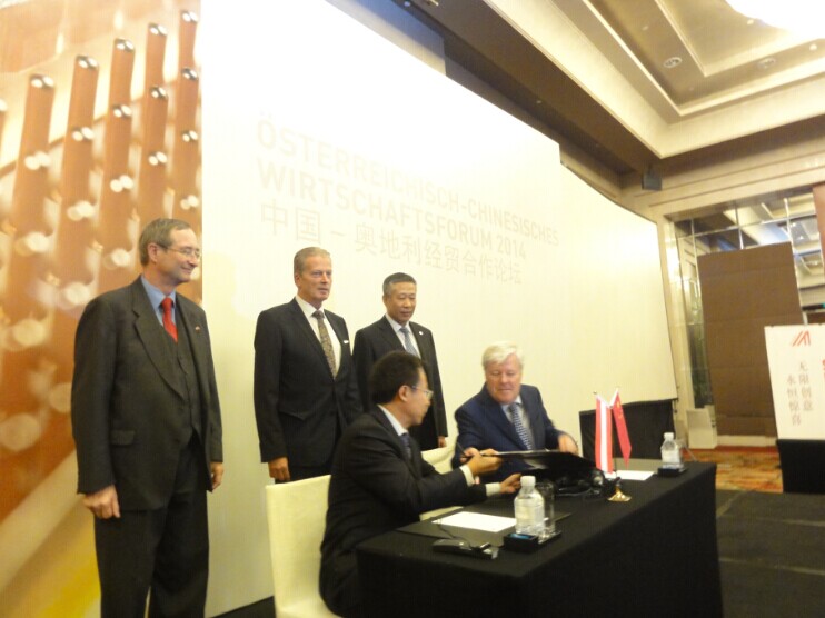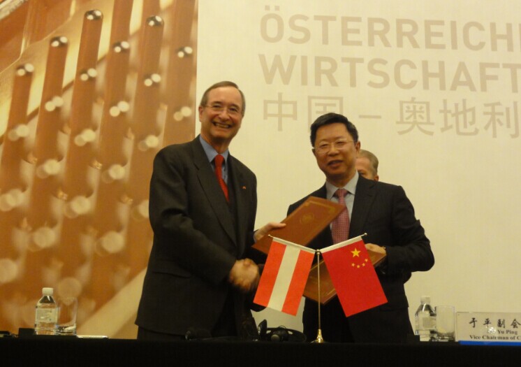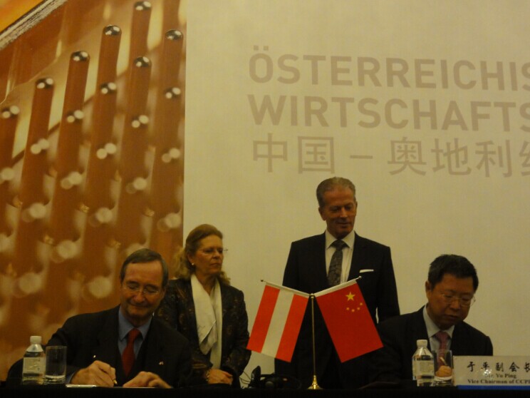在奥地利副总理兼科学、米特勒纳博士和奥地利驻华大使艾琳娜博士见证下,中国贸促会副会长于平先生(右1)和奥地利联邦商会主席克里斯托夫?莱特尔博士(左1)分别代表奥地利联邦商会和中国国际贸易促进委员会签署延长合作协议