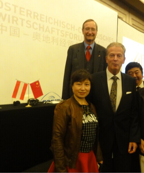 北京圣雨金秋影视文化传媒(Bliss & Blaze)中国区CEO王晓玲与奥地利联邦副总理兼科学、研究和经济部长莱因霍尔特.米特勒纳博士在2014年中-奥经济论坛上合影,奥地利联邦商会主席克里斯托夫?莱特尔博士无意中做了背景