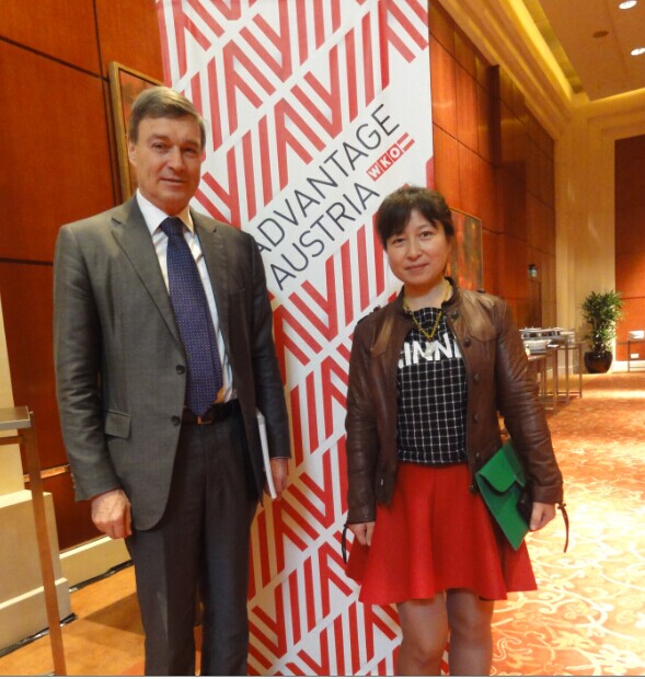 北京圣雨金秋影视文化传媒(Bliss & Blaze)中国区CEO王晓玲与欧盟驻华代表团大使史伟博士在2014年中-奥经济论坛上合影
