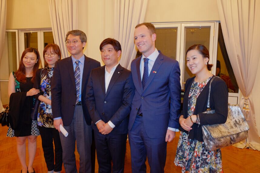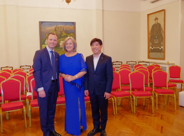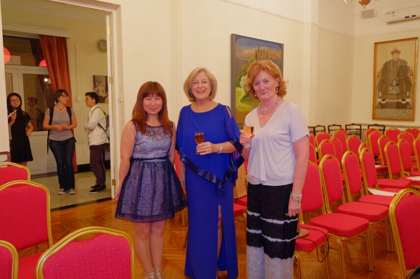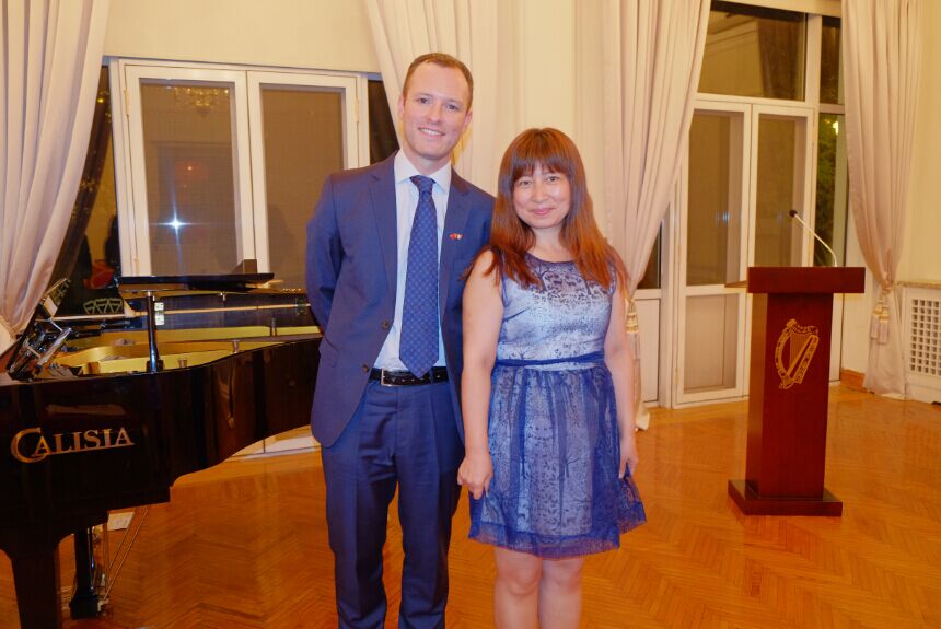 爱尔兰驻华大使馆一等秘书蓝海翔先生与弗吉尼亚.科尔女士、韩国钢琴演奏家Seho Lee合影